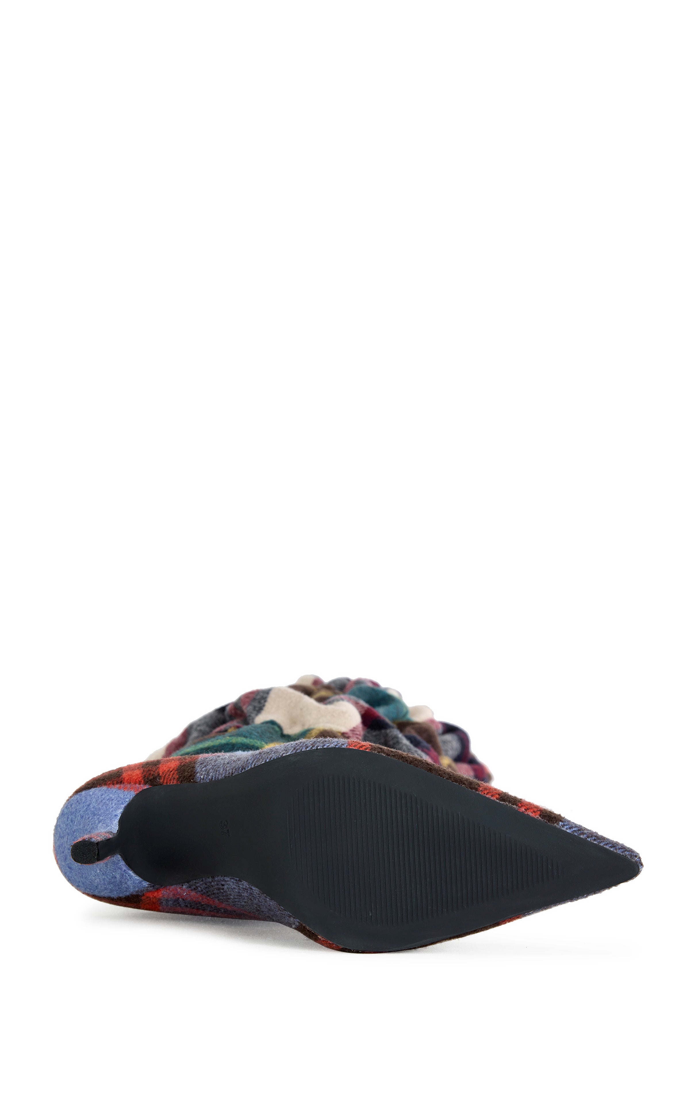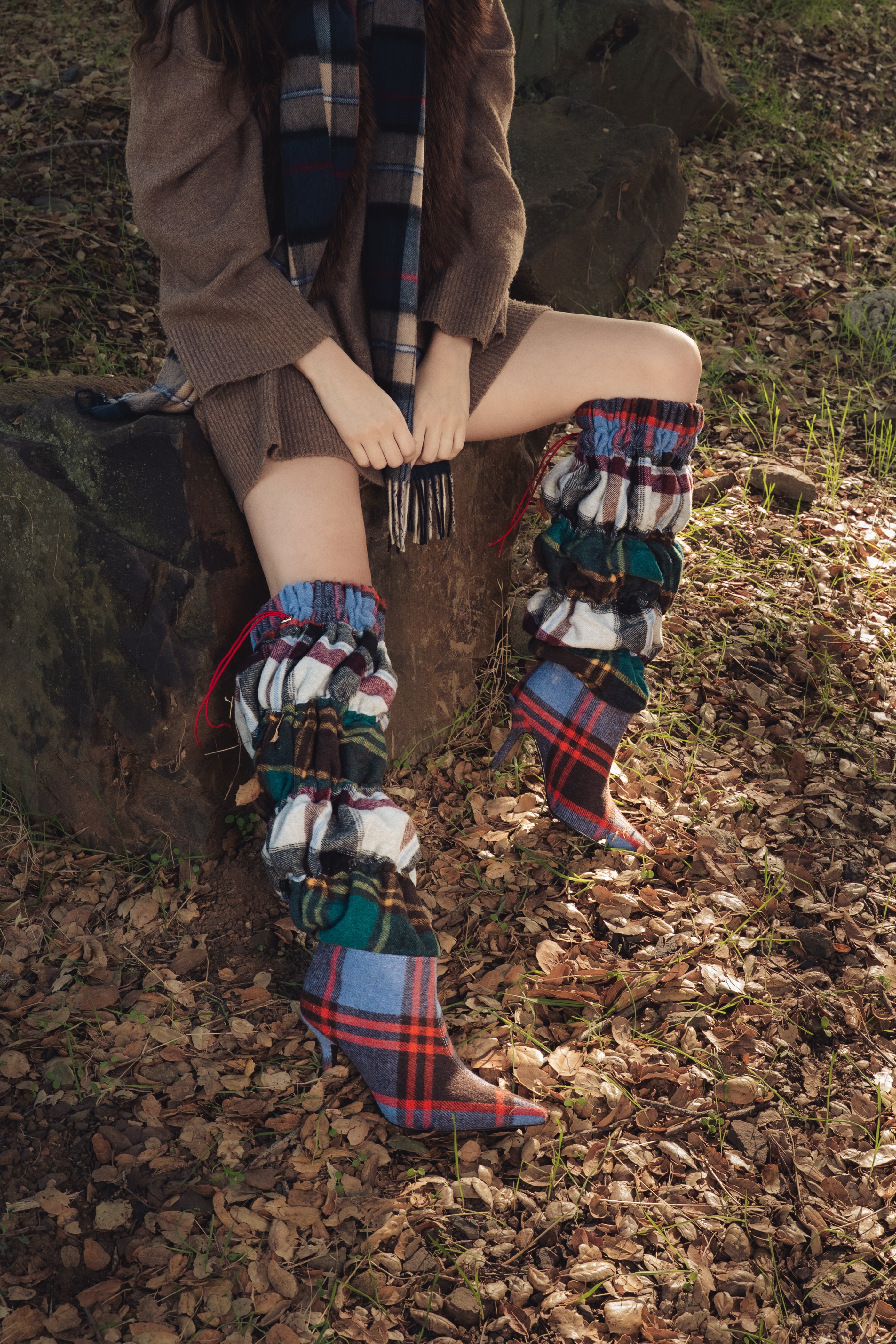 Plaid ruched over-the-knee stiletto boot with a pointed toe, blending bold pattern play with sleek, high-drama style.