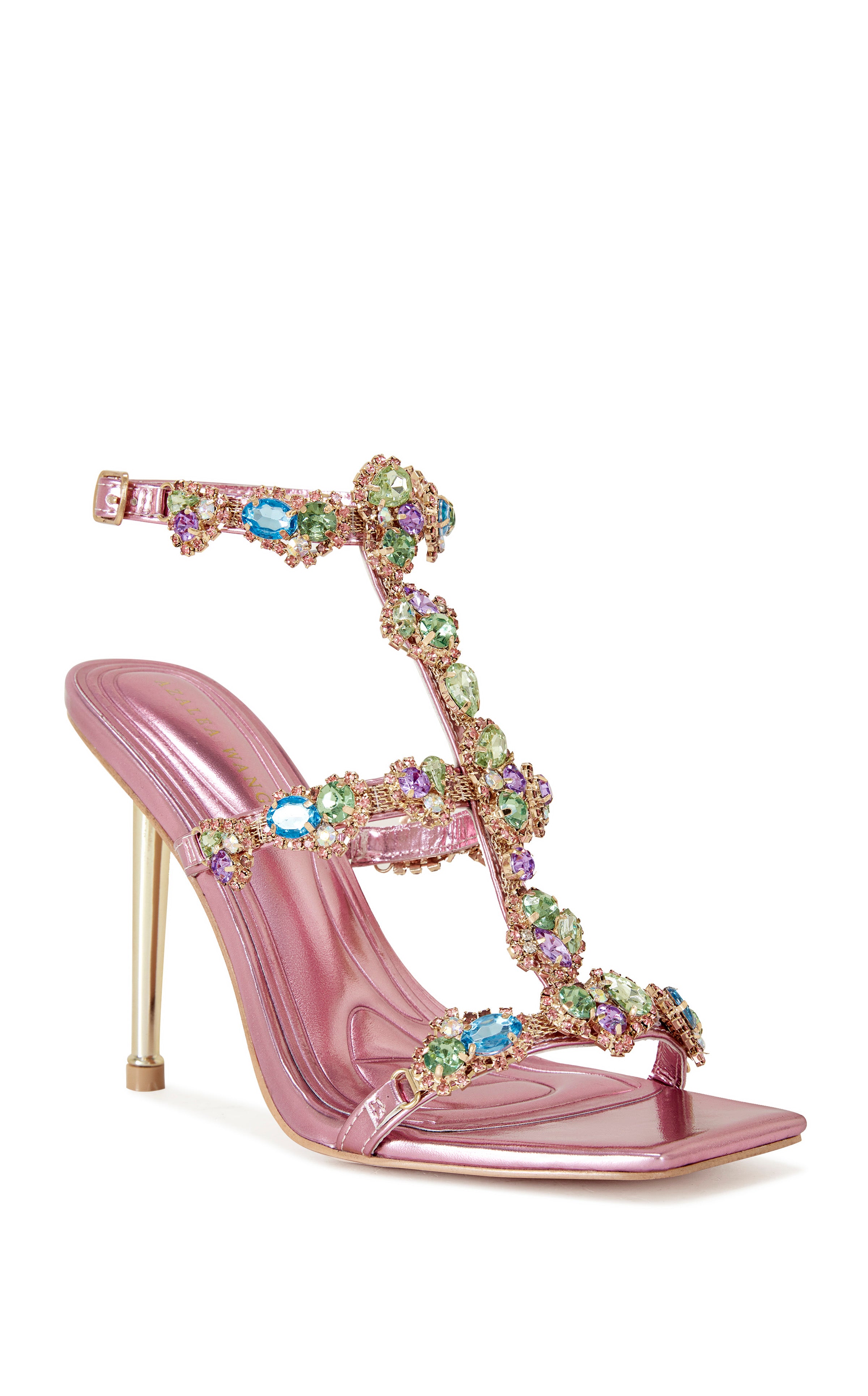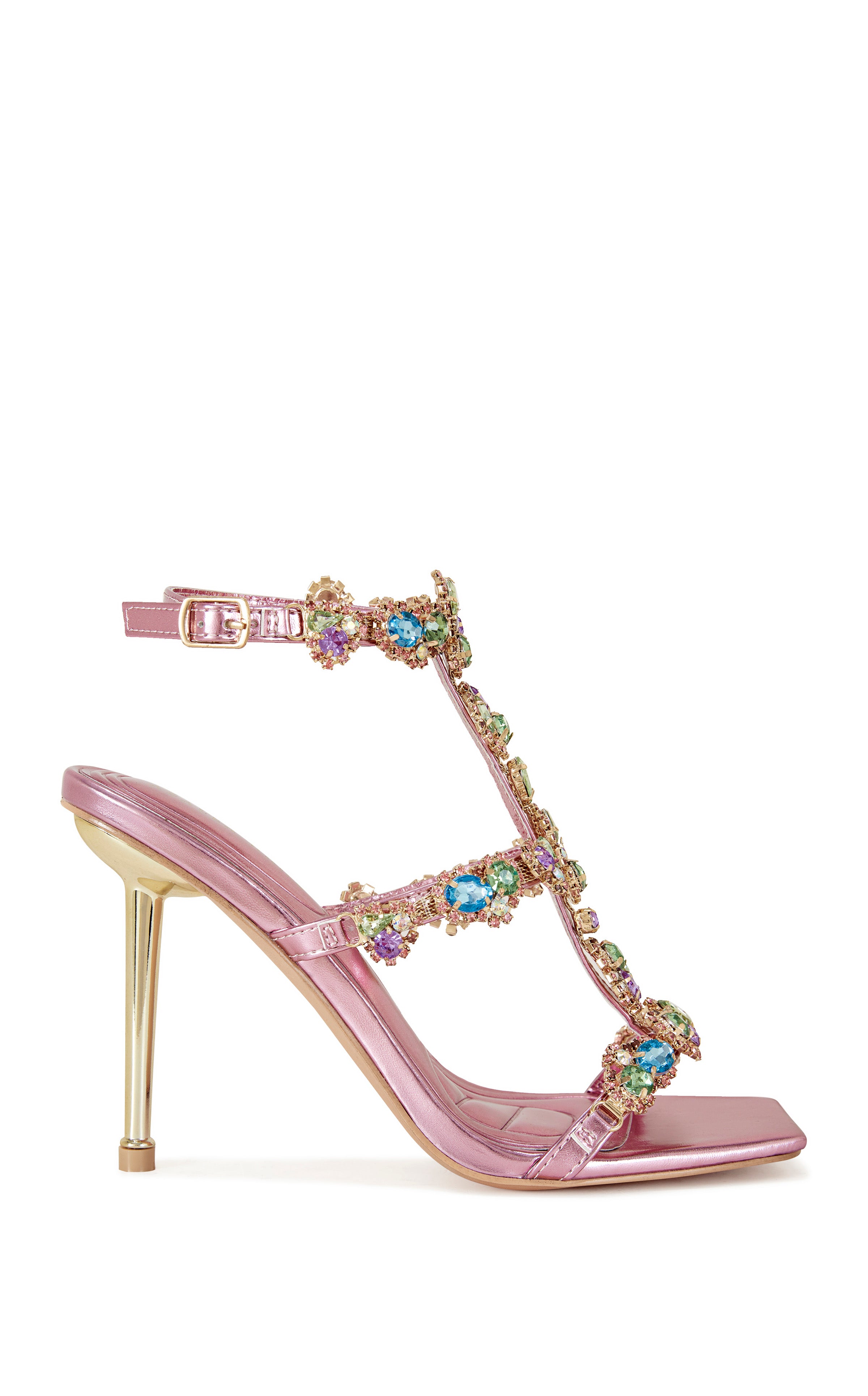 Square toe, stiletto sandal heels endowed with sparkling multicolored rhinestones.